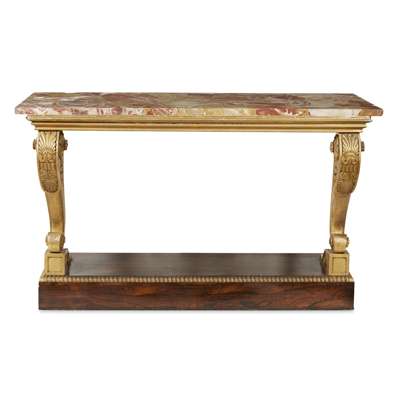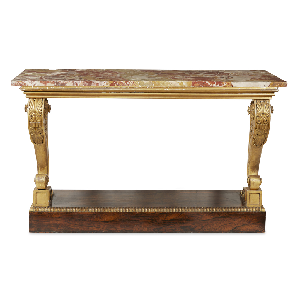 REGENCY ROSEWOOD, PARCEL GILT, MARBLE TOP CONSOLE TABLE Y