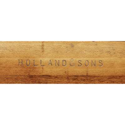 the rounded rectangular top above a pair of frieze drawers and gilt scrolling corner brackets, raised on squared end supports joined by a turned stretcher and ending on trestle bases with disc feet with recessed brass castors, the drawer stamped HOLLAND & SONS