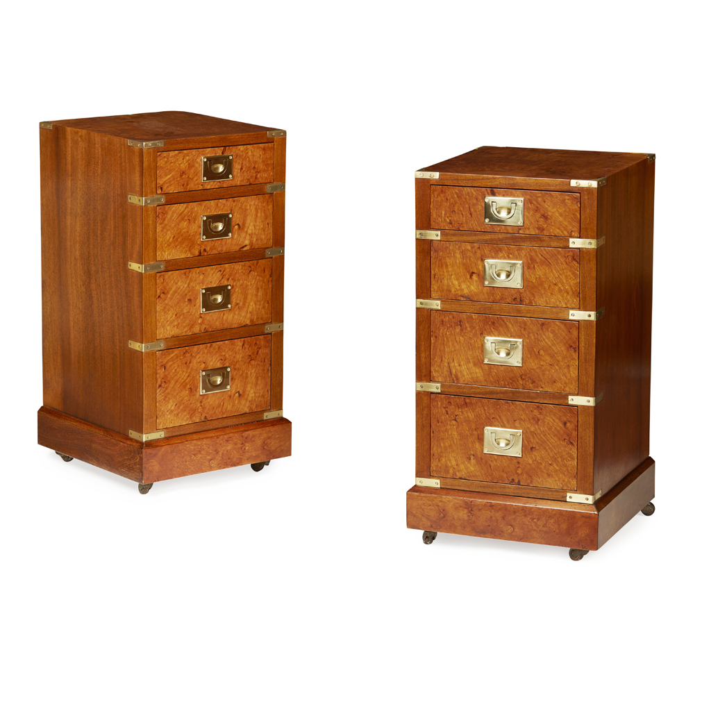 PAIR OF MAHOGANY AND WALNUT BRASS-MOUNTED CAMPAIGN STYLE BEDSIDE CABINETS