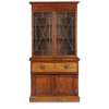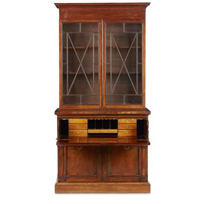 the projecting moulded cornice above a pair of astragal glazed doors opening to shelves; the associated base with a secretaire drawer opening to an interior fitted with drawers and pigeon holes, above a pair of panel doors flanked by pilasters, on a plinth base