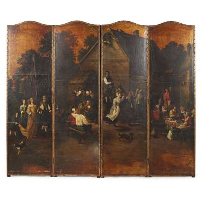 PAINTED LEATHER FOUR-FOLD SCREEN