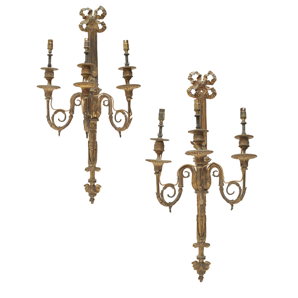 in the Louis XVI style, the ribbon-tied backplates issuing three foliate scrolling branches ending in urn nozzles, impressed foundry marks 'WS', electrified (2)
