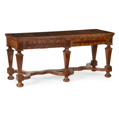 in the 17th century style, the rectangular top with oyster veneer crossbanding enclosing parquetry panels, above two frieze drawers, raised on square tapered legs with bun feet, joined by serpentine stretchers