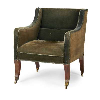 the straight low back and downswept enclosed arms over a cushioned seat, raised on curved square supports with brass caps and castors, in green plush upholstery