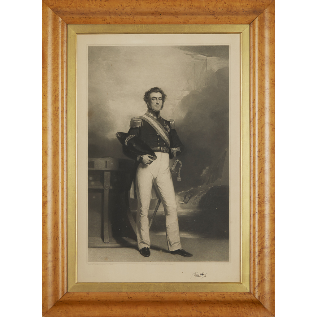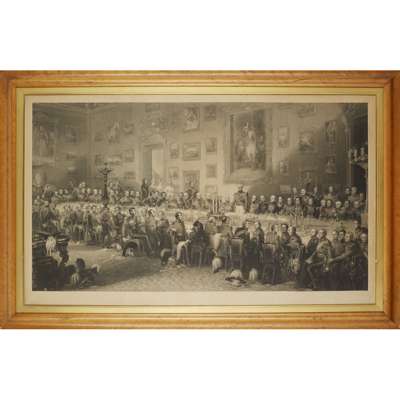 the first depicting 'The Waterloo Banquet at Apsley House' after William Salter, 70cm x 116cm (sight size); and the second a portrait of Rear Admiral Lord John Hay, after John Watson Gordon, 68cm x 44cm; in moulded satin birch frames with gilt slips (2)