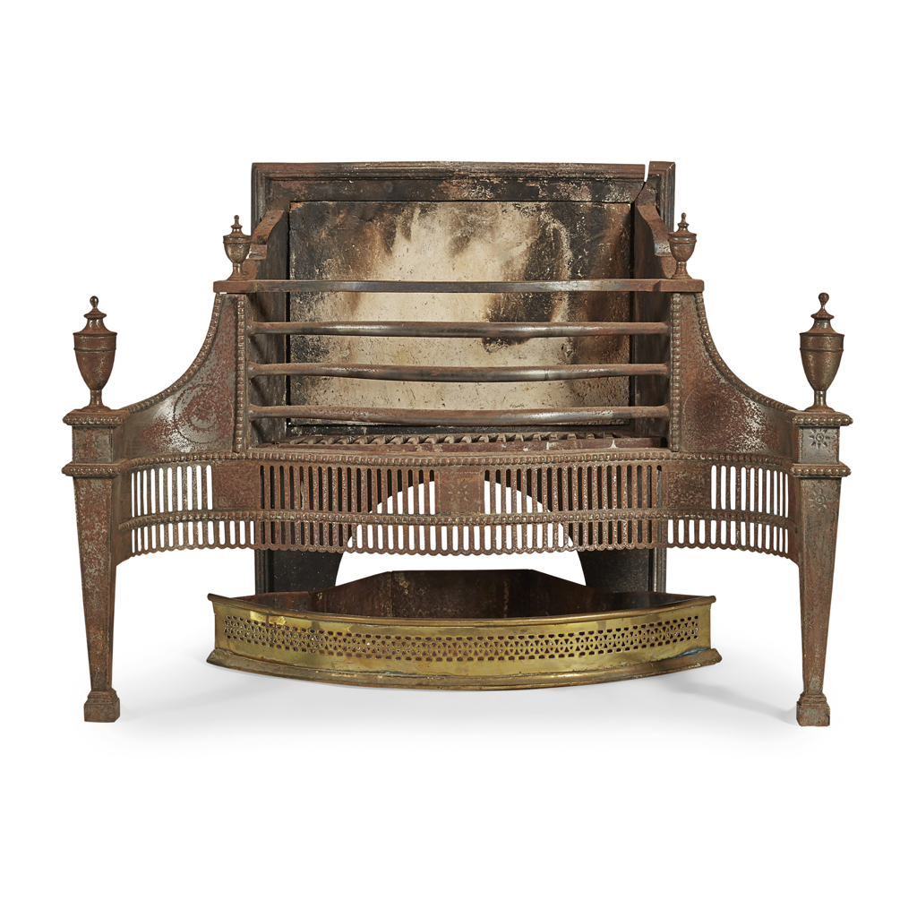 the arched back plate above a grate with four serpentine bars and pierced apron, the tapered square legs mounted with urn finials; together with an associated pierced brass ember tray (2)