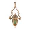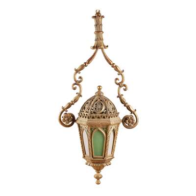 the pierced domed top above hexagonal arched panel sides with coloured glass panels, suspended by foliate clasped S-scrolls, fitted for electricity