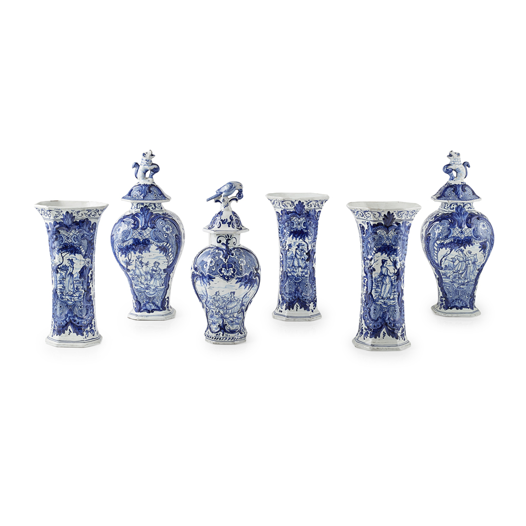 comprising a pair of covered baluster vases and three trumpet vases, painted with reserves of figures of pastoral scenes; together with a DELFT BLUE AND WHITE COVERED BALUSTER VASE, with a parrot finial, similarly decorated, 36cm high (6)