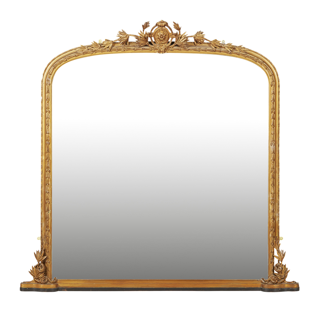 the arched mirror plate within a bead and foliate garland moulded frame with acanthus scrolls, surmounted by a foliate medallion and scrolled leaves