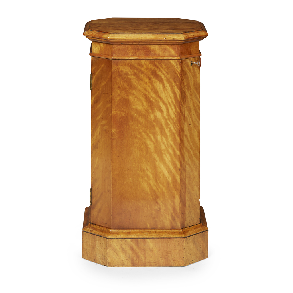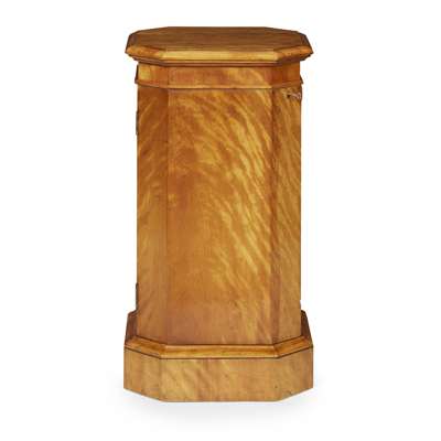 the octagonal top with a moulded edge over a long door opening to a shelved interior, on a moulded plinth base