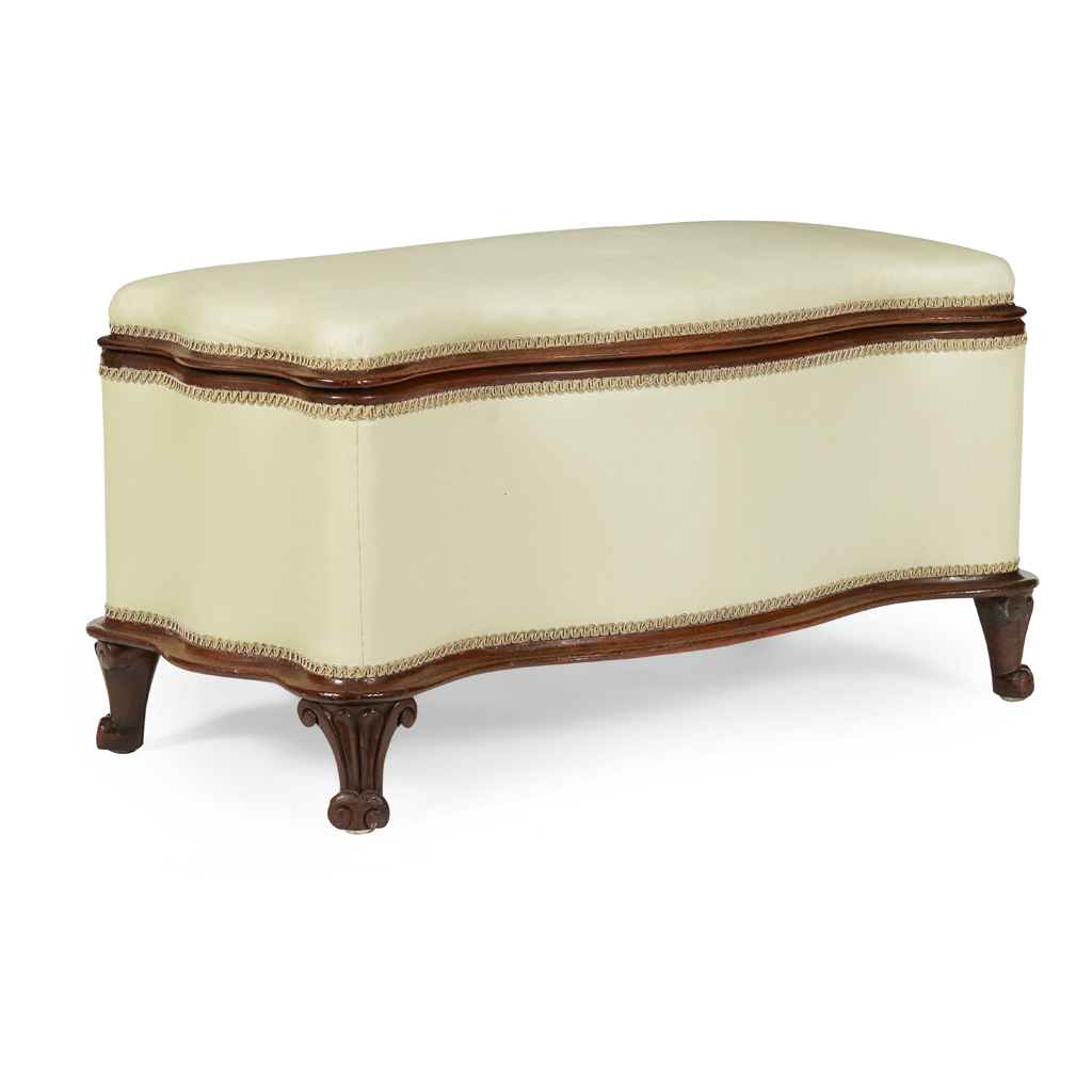 the padded and hinged serpentine top opening to a void interior, with a moulded base raised on lotus carved scrolled feet