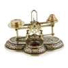with five graduated weights, on a serpentine-shaped stand with brass plaques depicting scrolling foliage on a red tortoiseshell ground, with maker's marks