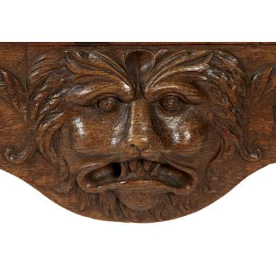 with a hinged upholstered cushion top above profusely carved on three sides with foliate scrolls, flowerheads and seedpods and centred by a lion mask, on carved scroll feet