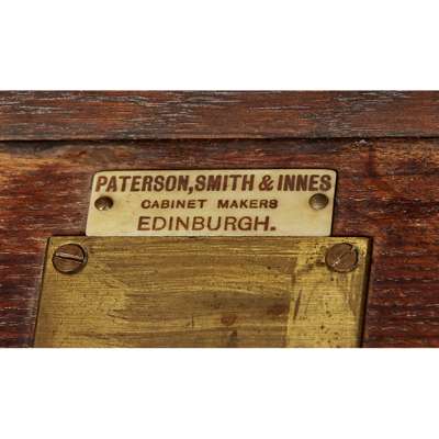 the rectangular top with a gilt tooled brown leather insert and leaf carved edge over a frieze with three short drawers, raised on pedestal supports of three short drawers, all carved with Green Man masks and scrolls, on plinth bases, the drawer with ivorine label PATERSON, SMITH & INNES/ CABINET MAKERS/ EDINBURGH.
