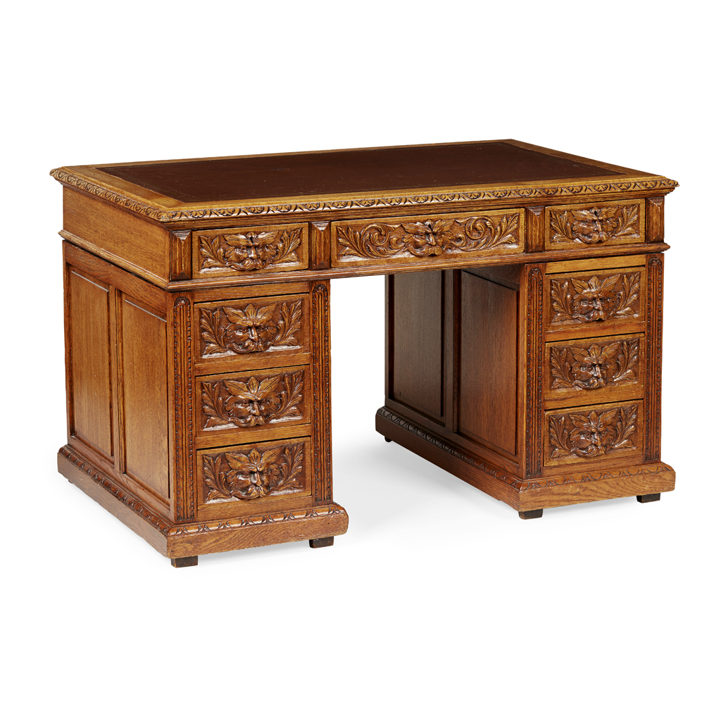 VICTORIAN CARVED OAK PEDESTAL DESK