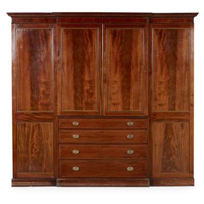 REGENCY MAHOGANY AND SATINWOOD BANDED BREAKFRONT COMPACTUM WARDROBE