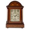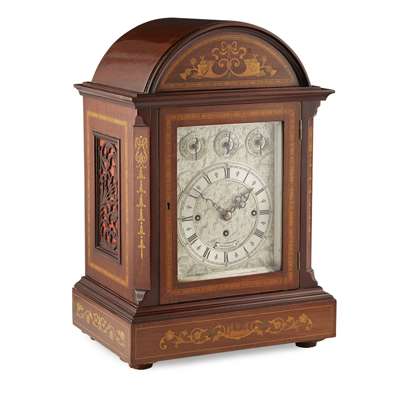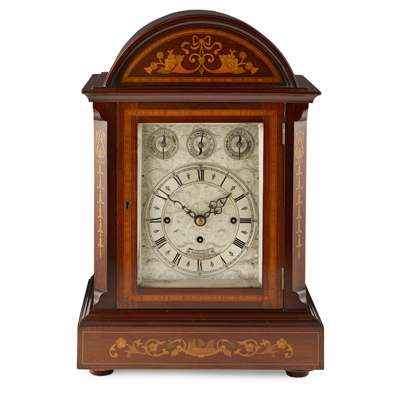 EDWARDIAN MAHOGANY, SATINWOOD, AND INLAID CHIMING BRACKET CLOCK