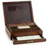 of rectangular form, opening to a fitted interior with glass mixing bowls, a palette and pigments, the interior lid with tooled leather insert and maker's marks, above a single drawer, with a key