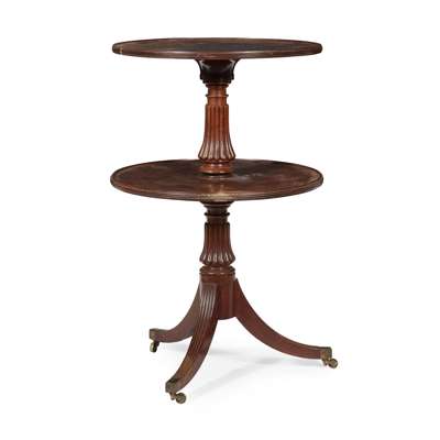 with two dished tiers raised on reeded columns, on three outswept reeded legs with brass caps and castors