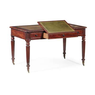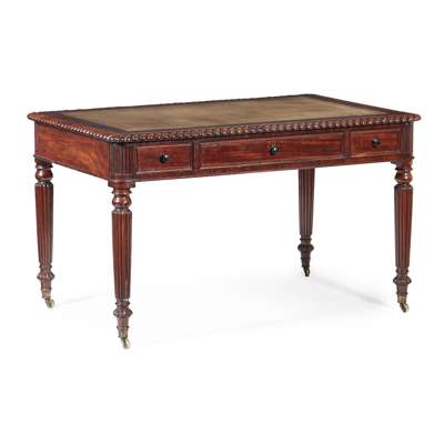 the rounded rectangular top with a gadrooned rim and gilt tooled green leather insert, over a central frieze drawer fitted with a writing slope, flanked by two short drawers, with two opposing dummy drawers, raised on reeded tapered legs with brass caps and castors