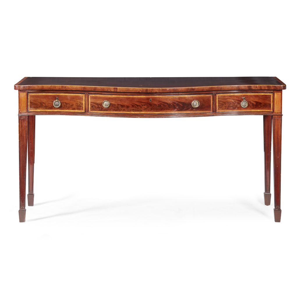 GEORGE III MAHOGANY AND SATINWOOD SERPENTINE SERVING TABLE