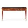 the serpentine top over three frieze crossbanded drawers, raised on channel moulded square tapered legs ending in spade feet