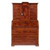 the moulded arched cornice over a central cupboard door enclosing a further panel door, flanked by banks of five short drawers; the lower section with a slant front enclosing an interior fitted with pigeon holes and drawers, over three long drawers, raised on short bracket feet