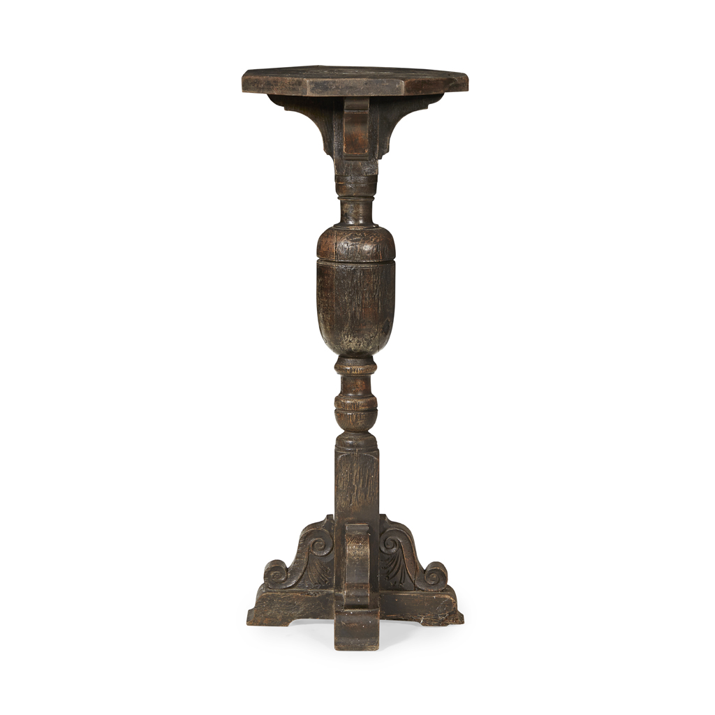 the octagonal top above a cup-and-cover baluster column with scroll brackets and cruciform base