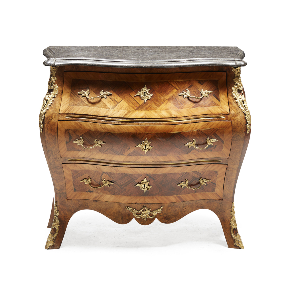 NORTH EUROPEAN KINGWOOD, WALNUT AND PARQUETRY BOMBE COMMODE