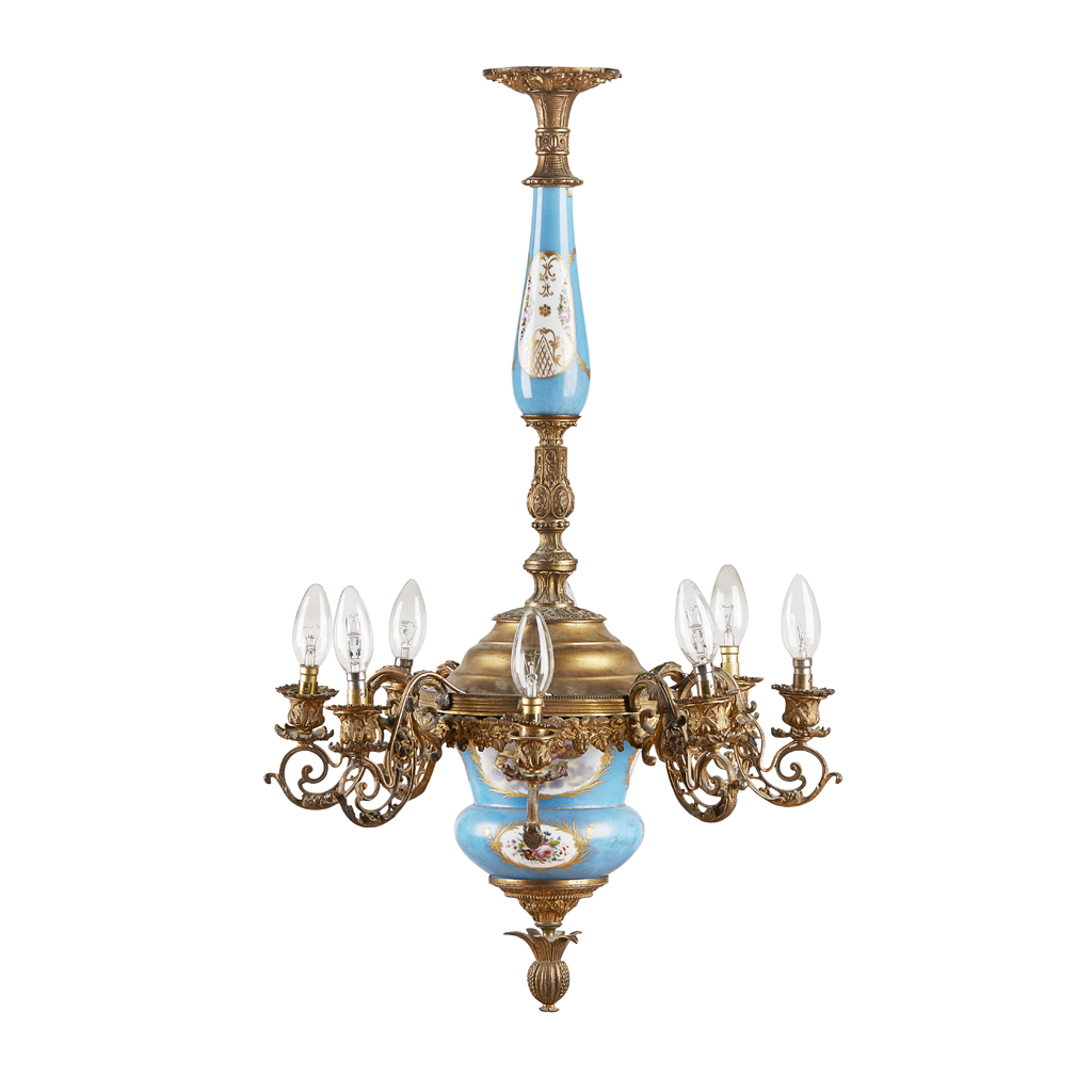 the central column with a porcelain baluster stem above a porcelain body painted with figures and flowers in the Sevres style, issuing eight scrolling branches, fitted with electricity