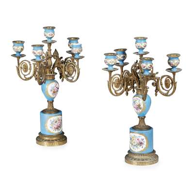 in the Sevres style, with central urns issuing one stiff and four scrolling candle arms with porcelain nozzles, on pedestal bases painted with flowers and portraits of ladies on a blue celeste ground (2)