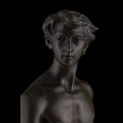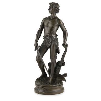 bronze, dark brown patina, signed A. GAUZEZ, on a circular base with an inscribed plaque LE DEVOIR/ PAR A. GAUDEZ/ HORS CONCOURS