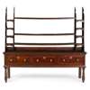 the top section with scrolled uprights and three open shelves flanked by short shelves, the base with a projecting moulded top over three short drawers, raised on baluster turned forelegs with replaced feet