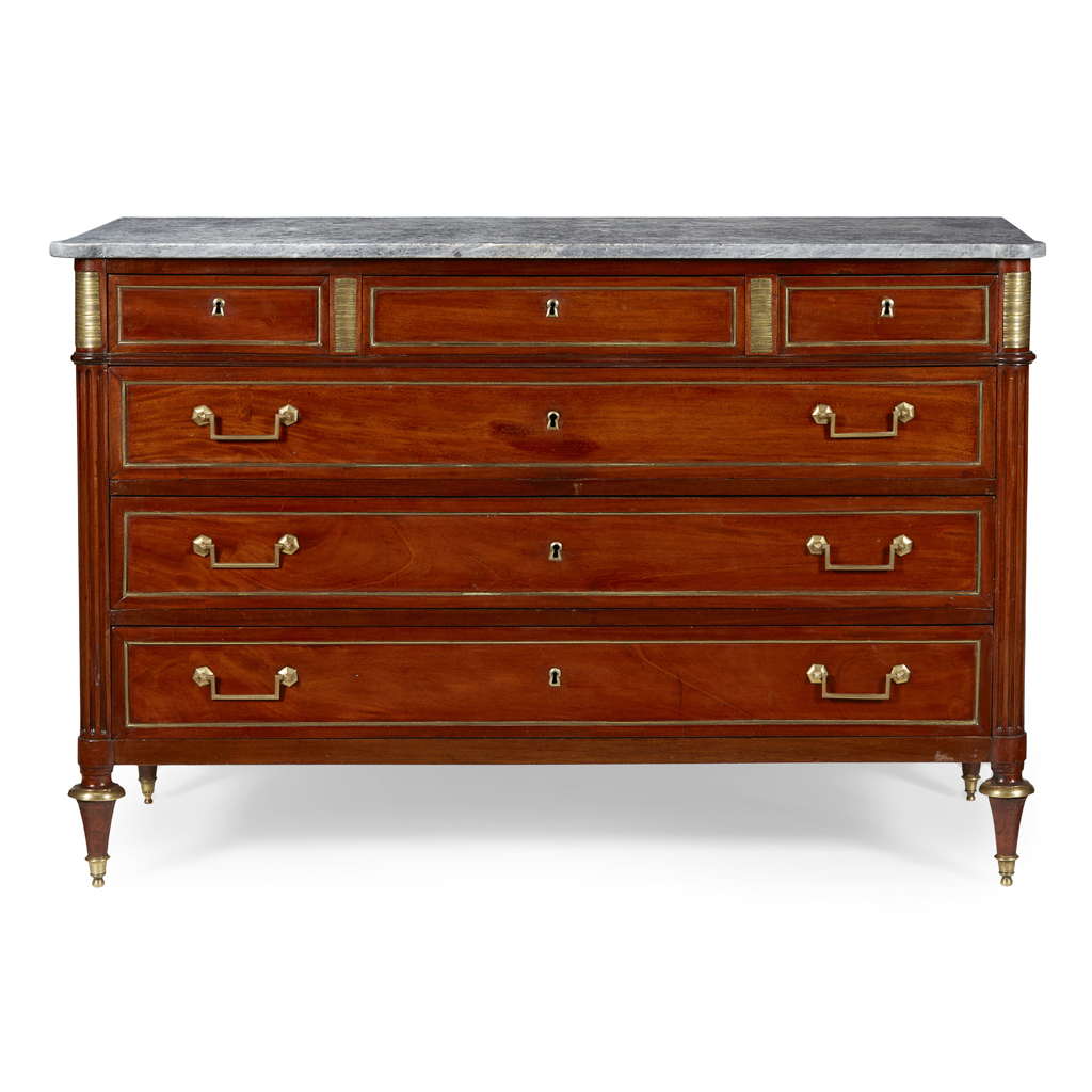 in the neo-classical style, the rectangular grey marble top with outset rounded corners above three short drawers with brass banding and separated by striated brass panels, above three long brass banded drawers flanked by fluted corner columns, raised on toupie feet with brass caps and collars
