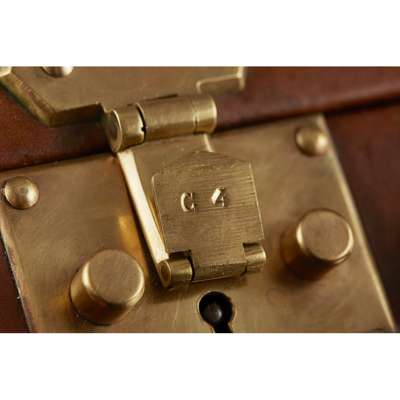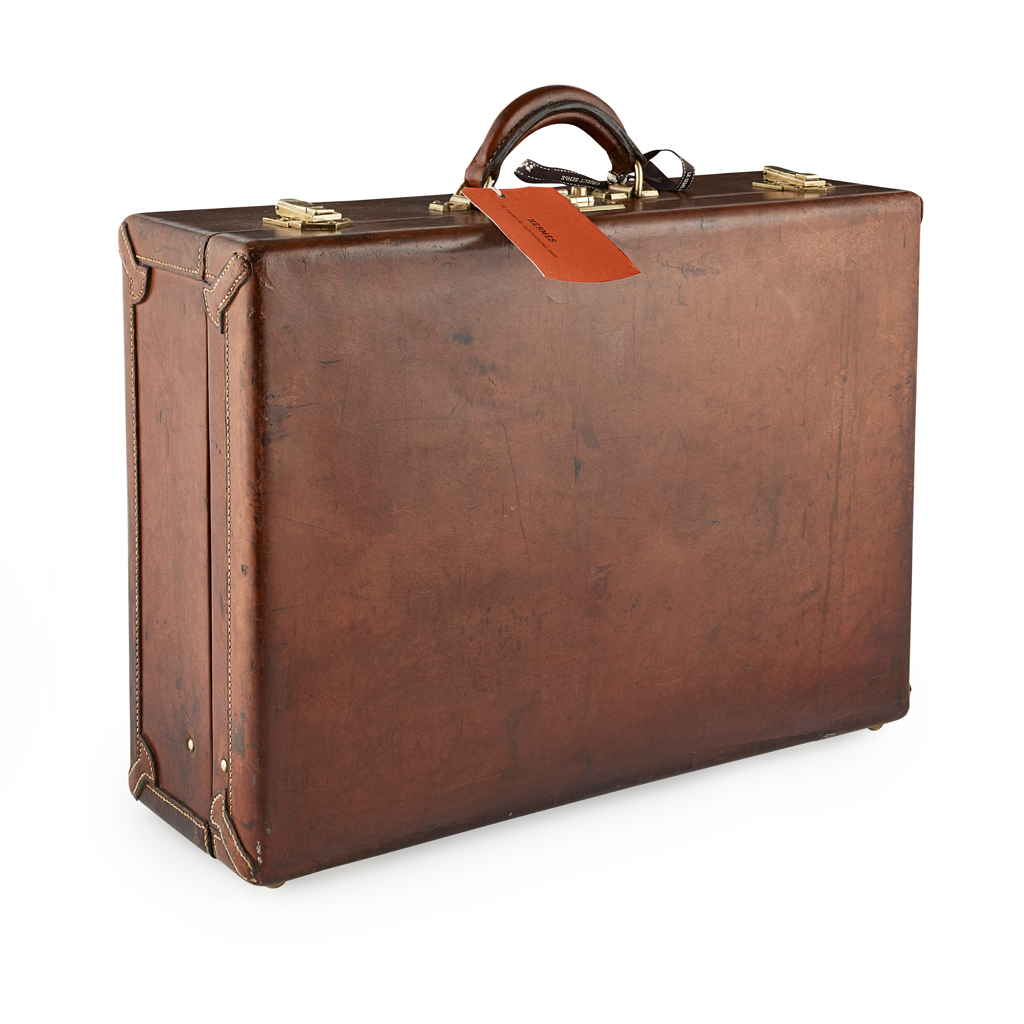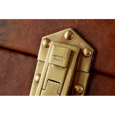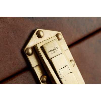with Hermès stamped lock and clasps, opening to a void, cotton-lined interior with two leather straps, with maker's stamp