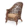 the arched curved back and enclosed arms pierced and carved with scrolling leaves and fruiting vines, above a padded seat, raised on cabriole legs ending on foliate scrolled toes with ceramic castors