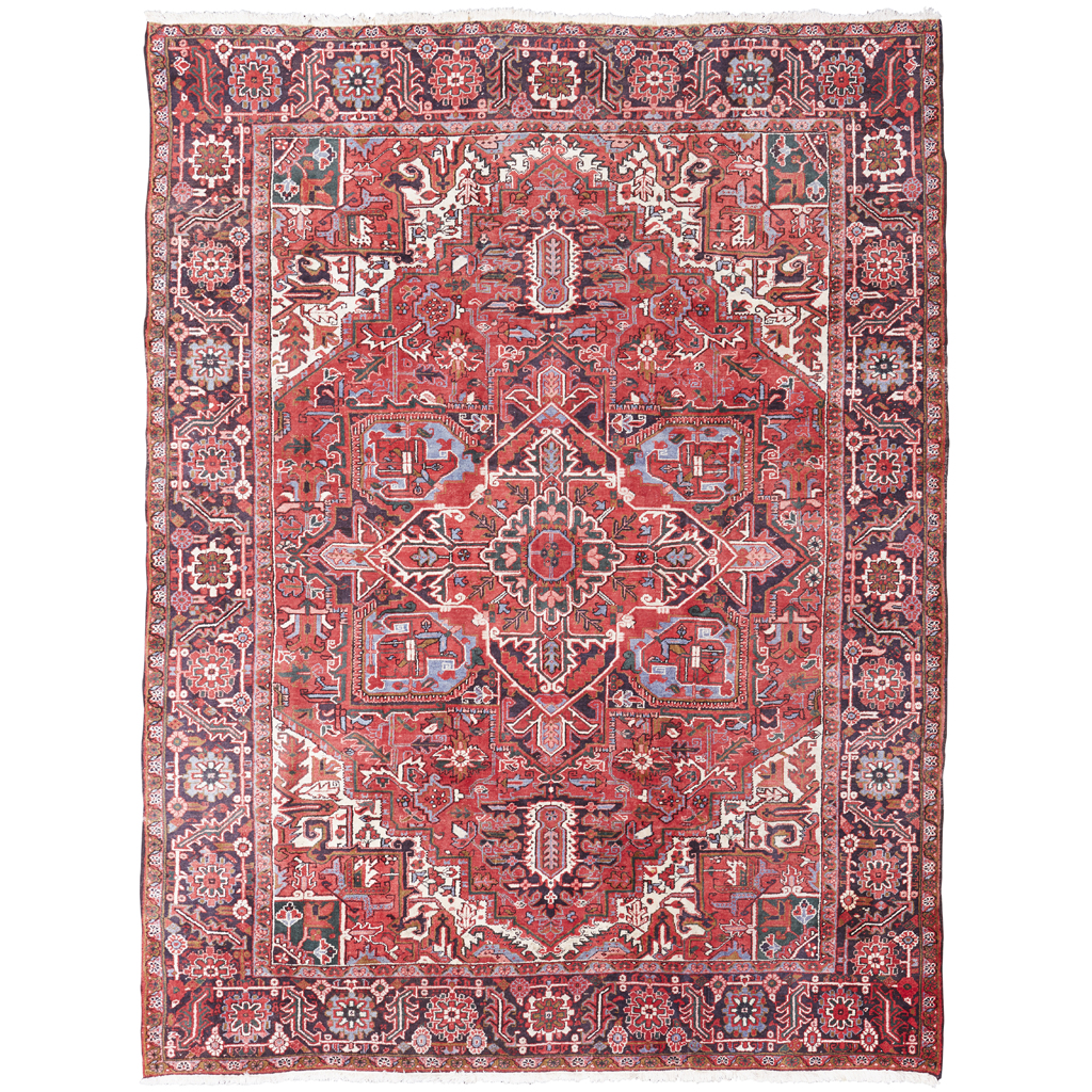 the red field with indigo and red medallion, ivory red and green spandrels, within indigo rosette and vine border