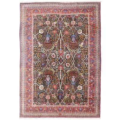 the bottle green field with allover lattice pattern of palmettes, floral vases and foliate motifs, within red arabesque, palmette and vine border