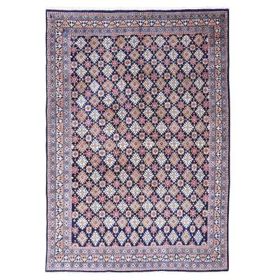 the indigo field with allover cream and brown serrated lozenge and red rosette pattern, within narrow indigo arrowhead border