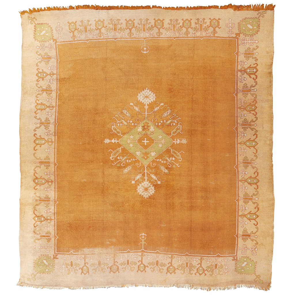 the plain orange field with green lozenge medallion, within light orange geometric border