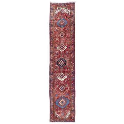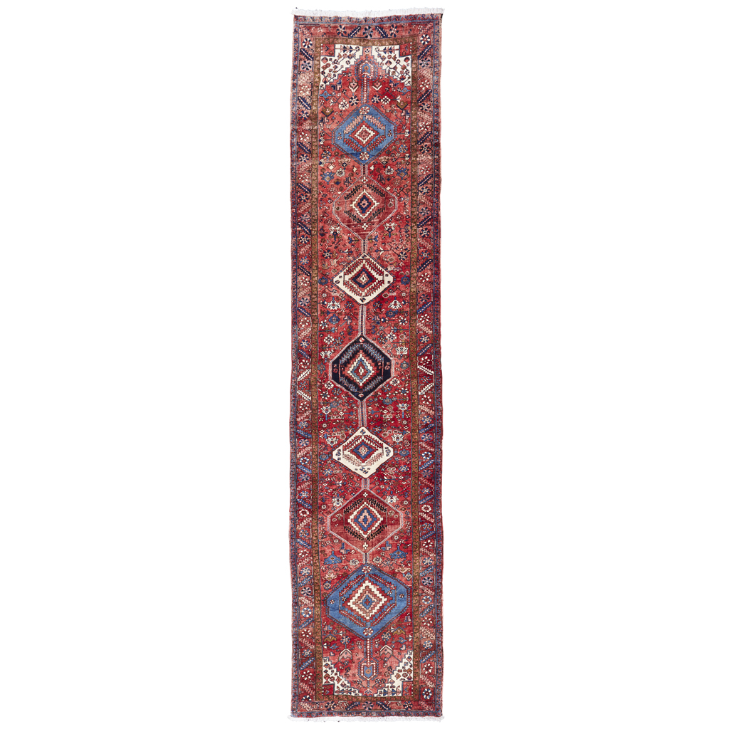 the abrash red field with seven blue, red and ivory lozenge medallions, within red rosette and vine border
