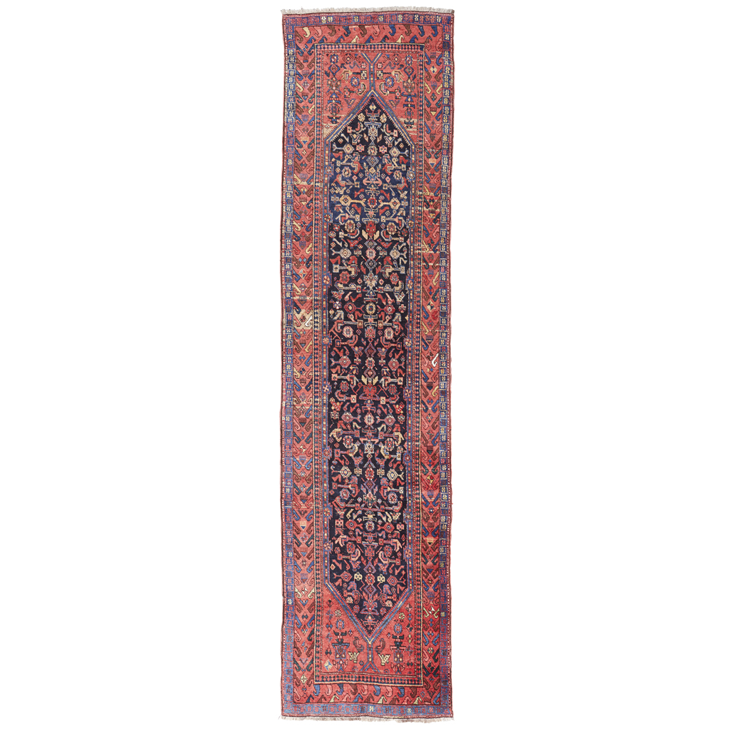 the indigo field with allover herati pattern, red spandrels, within red hooked border