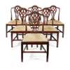 the curved and arched top rails carved with husk trails centred by a flowerhead, above a pierced and carved baluster splat and square drop-in padded seat, in a reeded seat rail, raised on chamfered square straight legs (6)