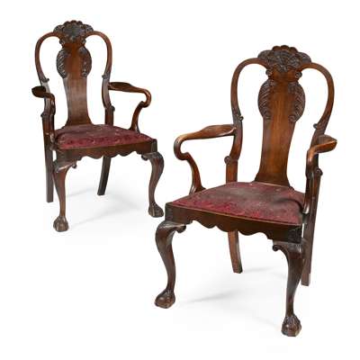 comprising six side chairs and a pair of armchairs, the shaped top rails carved with wheat sheafs above foliate carved baluster splats and drop-in seats, raised on moulded cabriole legs with ball and claw feet (8)