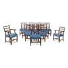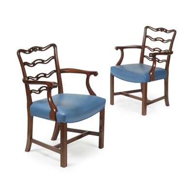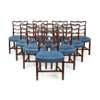 comprising ten side chairs and a pair of armchairs, the serpentine ladder backs with pierced splats and centred by an anthemion, above wide bowed seats in blue leather, raised on channel carved square straight legs joined by an H stretcher (12)