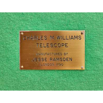 marked RAMSDEN/ LONDON, with a finderscope, raised on a brass tripod stand, in a later baize-lined box on a wheeled stand, the later plaque to lid with inscription CHARLES M. WILLIAMS/ TELESCOPE/ MANUFACTURED BY JESSE RAMSDEN/ LONDON 1790