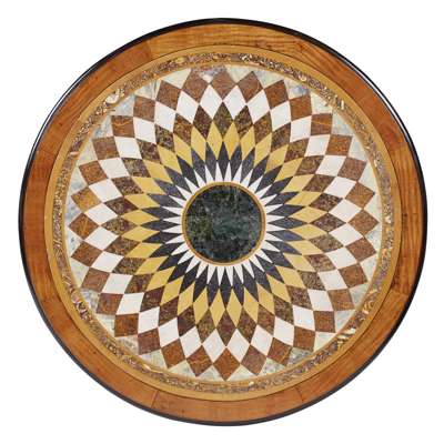the circular top inlaid with radiating bands of contrasting marbles and hardstones, within a moulding ebonised border, on a lotus carved column support and triform base raised on ebonised scroll feet with brass castors