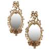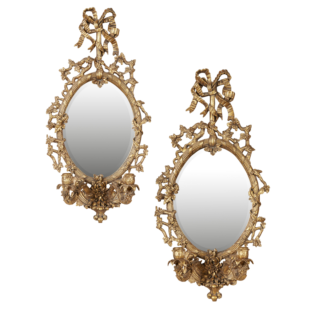 each with bevelled oval mirror plates within pierced foliate carved frames surmounted by ribbon tied cresting, each issuing two foliate carved candle arms (2)