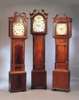 the twin train movement with anchor escapement striking on a bell, the dial painted with lovers to the arch and the four seasons, with Roman chapters and subsidiary seconds and date dials, the swan neck hood with columns, the crossbanded trunk with quarter columns