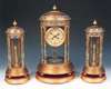 the clock in the form of a circular domed roof supported by six Corinthian columns partially enamelled, the clock of circular form and with mercurial pendulum; the companion pieces of similar form with a winged sphinx to the centre, each on a turned gilt wood stand, clock height 48.5cm, companion pieces height 38.5cm
